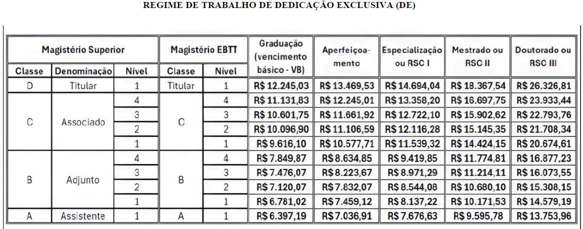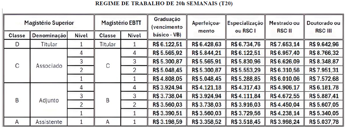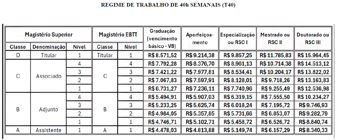 Tabelas salariais vigentes a partir de 01/04/2026 em pdf publicado pelo ANDES-SN: Circ022-2026 – ANEXO I – TABELAS SALARIAIS COM VIGÊNCIA A PARTIR DE 01-04-2026 – ANEXO II – QUADRO RESUMO